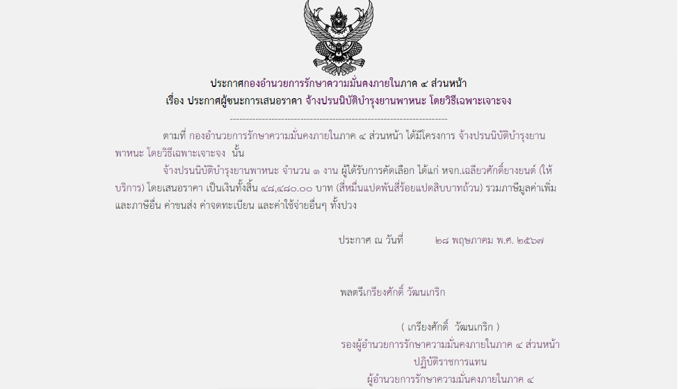 ประกาศผู้ชนะการเสนอราคา จ้างปรนนิบัติบำรุงยานพาหนะ โดยวิรีเฉพาะเจาะจง