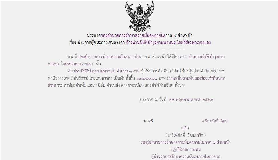 ประกาศผู้ชนะการเสนอราคา จ้างปรนนิบัติบำรุงยานพาหนะ โดยวิรีเฉพาะเจาะจง