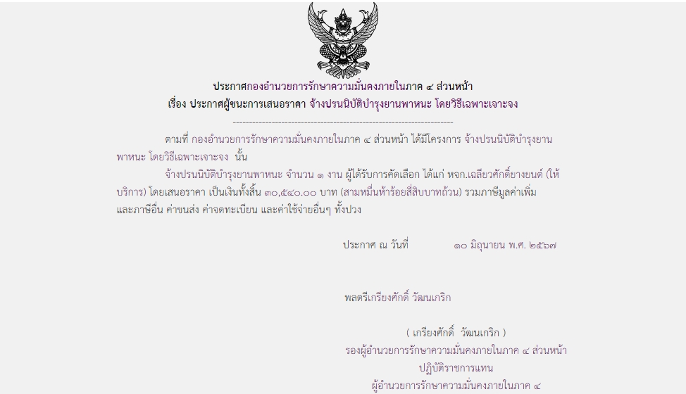 ประกาศผู้ชนะการเสนอราคา จ้างปรนนิบัติบำรุงยานพาหนะ โดยวิธีเฉพาะเจาะจง