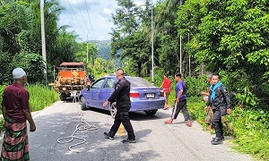 เมื่อวันที่ 14 มิถุนายน 2567 เวลา 14.30 น. หน่วยเฉพาะกิจกรมทหารพรานที่ 45 นำกำลังพลชุดปฏิบัติการกิจการพลเรือน กองร้อยทหารพรานที่ 4510 เข้าให้การช่วยเหลือประชาชนประสบอุบัติเหตุทางถนน บริเวณถนนในหมู่บ้านกูตง หมู่ที่ 3 ตำบลบองอ อำเภอระแงะ จังหวัดนราธิวาส จากการลงพื้นที่พบรถยนต์เก๋งส่วนบุคคลตกไหล่ทาง โดยมีนายรอซูวัน มะแซ ซึ่งเป็นประชาชนในพื้นที่เป็นผู้ขับขี่รถยนต์ดังกล่าว เบื้องต้นไม่ได้รับบาดเจ็บแต่อย่างใด เจ้าหน้าที่ทหารพรานจึงได้ร่วมกับประชาชนในพื้นที่ ช่วยกันลากรถคันดังกล่าวขึ้นมาบนถนนได้อย่าปลอดภัย