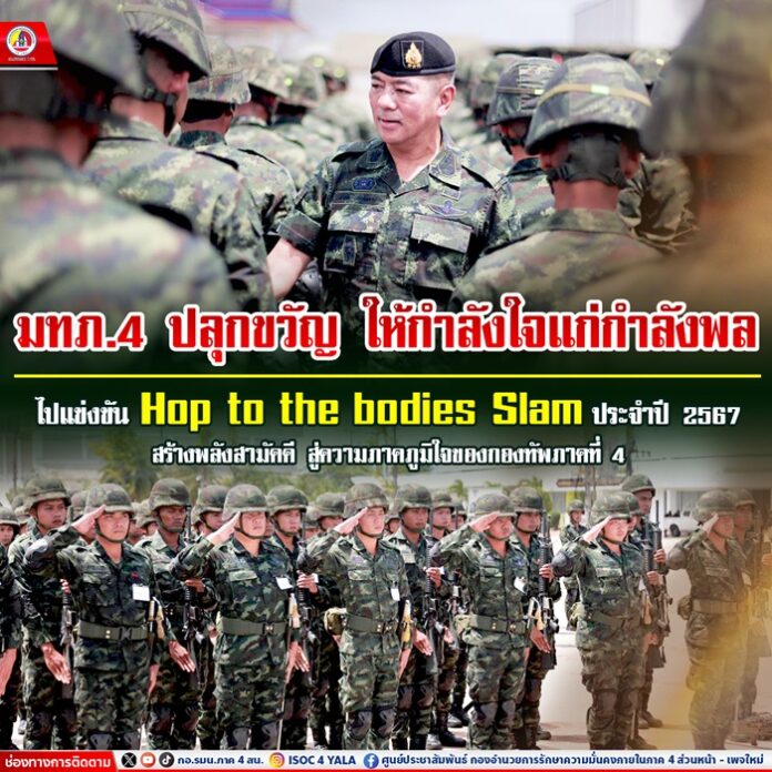 วันนี้ 17 มิถุยายน 2567 เวลา 11.00 น. ณ ลานพื้นแข็ง ศาลาสุริโยทัย กองพลทหารราบที่ 15 ค่ายสมเด็จพระสุริโยทัย ตำบลบ่อทอง อำเภอหนองจิก จังหวัดปัตตานี พลโท ศานติ ศกุนตนาค แม่ทัพภาคที่ 4 / ผู้อำนวยการรักษาความมั่นคงภายในภาค 4 ให้โอวาทและกำลังใจแก่ผู้เข้าแข่งขันการฝึกทางทหารประกอบดนตรี “ราชวัลลภเริงระบำ” Hop to the bodies Slam ประจำปี 2567 ที่จะต้องเดินทางไปทำการแข่งขันระดับกองทัพไทย เพื่อเป็นการปลุกพลัง สร้างขวัญกำลังใจแก้กำลังพลผู้เข้ารับการแข่งขัน