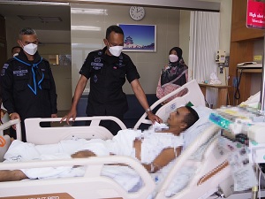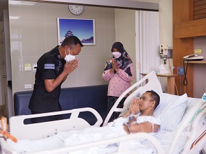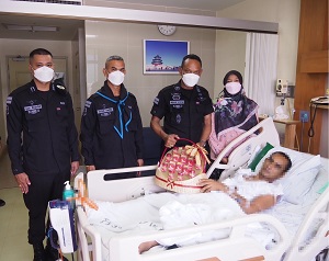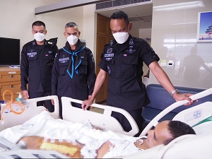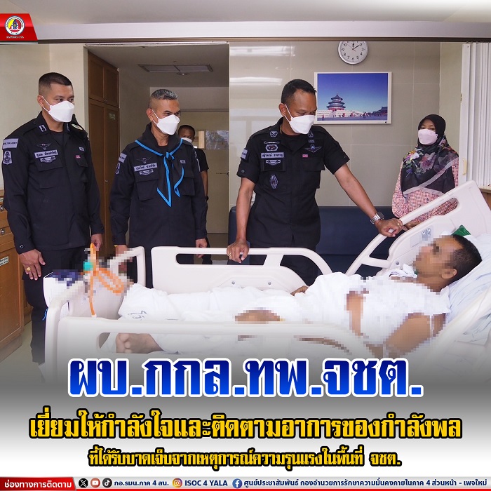 โดย ผู้บังคับกองกำลังทหารพรานจังหวัดชายแดนภาคใต้ ได้พูดคุยเพื่อสอบถามอาการบาดเจ็บ และขอให้มีขวัญและกำลังใจที่ดีกลับมาปฏิบัติงานได้อย่างมีประสิทธิภาพในเร็ววัน ซึ่งจากการพูดคุยกับแพทย์ผู้ให้การรักษา ทราบว่าอาการของผู้บาดเจ็บดีขึ้นตามลำดับ พร้อมกันนี้ได้มอบกระเช้าเยี่ยม และเงินช่วยเหลือขั้นต้นเพื่อเป็นขวัญกำลังใจให้กำลังพลอีกด้วย