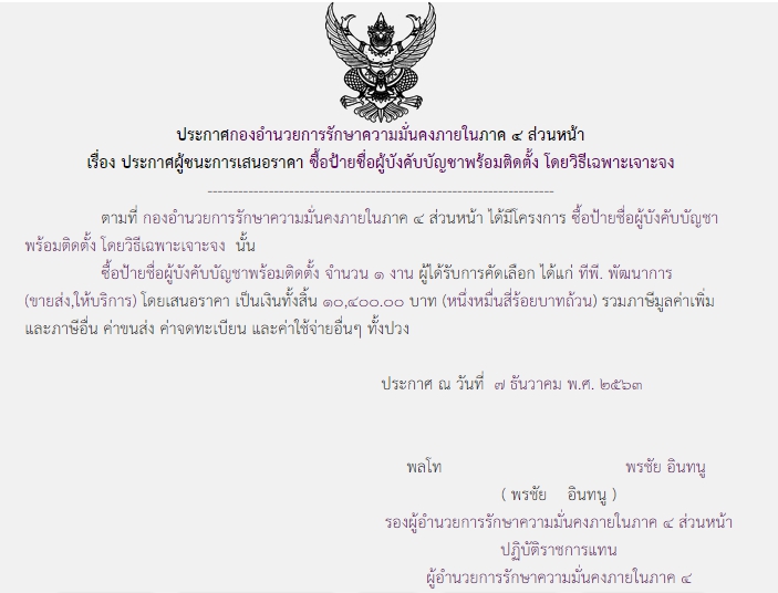 จัดซื้อ จัดจ้างประกาศผู้ชนะการเสนอราคา ประกาศผู้ชนะการเสนอราคา ซื้อป้ายชื่อผู้บังคับบัญชาพร้อมติดตั้ง โดยวิธีเฉพาะเจาะจง ( ๑๐,๔๐๐.๐๐ บาท ) December 8, 2020 1003 Share Facebook Twitter Google+ Telegram LINE