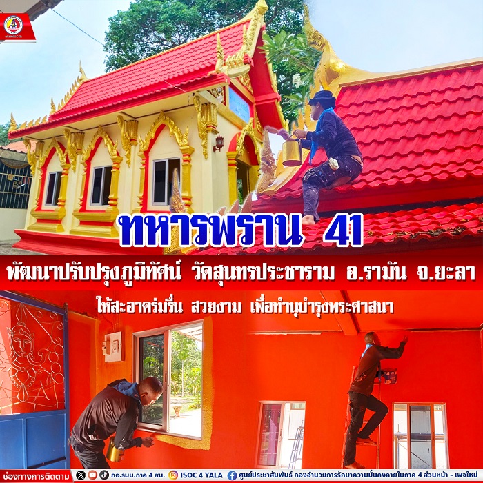 วันที่ 19 มิถุนายน 2567 เวลา 09.30 น. ที่วัดสุนทรประชาราม บ้านรามัน หมู่ที่ 1 ตำบลกายูบอเกาะ อำเภอรามัน จังหวัดยะลา หน่วยเฉพาะกิจกรมทหารพรานที่ 41 จัดกำลังพล ชุดปฏิบัติการกิจการพลเรือน กองร้อยทหารพรานที่ 4104 ร่วมทำกิจกรรมพัฒนาและปรับปรุงภูมิทัศน์วัดสุนทรประชาราม เพื่อสร้างความเป็นระเบียบเรียบร้อยและสวยงาม โดยได้ทำความสะอาดบริเวณพื้นที่โดยรอบวัด พร้อมทั้งทาสีใหม่ให้วัดสวยงามมากยิ่งขึ้น เพื่อทำให้ทัศนียภาพของสถานที่ต่าง ๆ ของวัดสวยงามขึ้น และสร้างความประทับใจแก่ผู้มาทำบุญและปฏิบัติธรรม