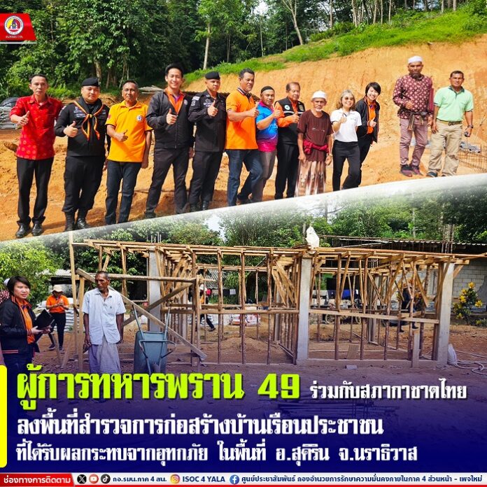 เมื่อวันที่ 19 มิถุนายน 2567 เวลา 13.00 น. พันเอก ภาณุวัฒน์ สุคชเดช ผู้บังคับหน่วยเฉพาะกิจกรมทหารพรานที่ 49 พร้อมด้วย ผู้บังคับกองร้อยทหารพรานในพื้นที่อำเภอสุคิริน หน่วยงานในพื้นที่ ร่วมกับประชาชนที่ได้รับผลกระทบจากอุทกภัยให้การต้อนรับ เจ้าหน้าที่มูลนิธิอาสาเพื่อนพึ่ง (ภา) ยามยาก สภากาชาดไทย ลงพื้นที่สำรวจพื้นที่ดำเนินการก่อสร้างบ้านเรือนประชาชนที่ได้รับความเสียหายจากอุทกภัย จำนวน 19 หลัง ในพื้นที่ หมู่ที่ 3 (บ้านปารี) ตำบลมาโมง อำเภอสุคิริน จังหวัดนราธิวาส ซึ่งเป็นพื้นที่ในเครือข่ายเตือนภัยพิบัติชุมชนเพื่อนพึ่ง (ภาฯ) และเป็นพื้นที่ที่ได้รับความเสียหายอย่างหนักเป็นวงกว้างจากน้ำท่วมฉับพลันและดินโคลนถล่ม ทำให้บ้านเรือนเสียหายหนักสุดในรอบ 50 ปี ระหว่างวันที่ 23 – 26 ธันวาคม 2566 ที่ผ่านมา
