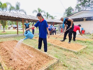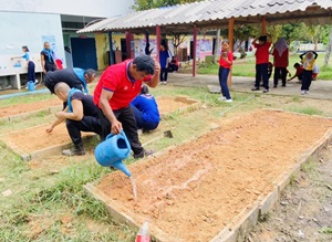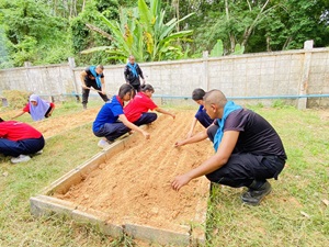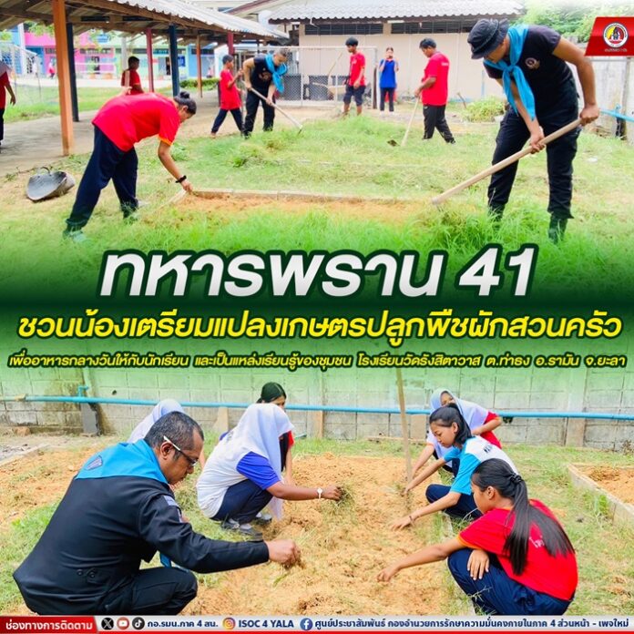 เมื่อวันที่ 20 มิถุนายน 2567 เวลา 14.00 น. หน่วยเฉพาะกิจกรมทหารพรานที่ 41 จัดกำลังพล ชุดปฏิบัติการกิจการพลเรือน กองร้อยทหารพรานที่ 4115 ร่วมกับ ผู้อำนวยการสถานศึกษา, คณะครู และนักเรียน ดำเนินการขับเคลื่อนตามแผน โครงการชุมชนเบิกบาน อาหารปลอดภัย จิตอาสาฟาร์มตัวอย่าง สู่สถานศึกษา ขยายผลสู่ชุมชน โดยการเตรียมพื้นที่แปลงเกษตรในการปลูกพืชผักสวนครัว และติดตามการดำเนินโครงการฯ สำหรับผลิตอาหารกลางวันให้กับนักเรียนและเป็นแหล่งเรียนรู้ของชุมชน ณ โรงเรียนวัดรังสิตาวาส หมู่ที่ 4 ตำบลท่าธง อำเภอรามัน จังหวัดยะลา