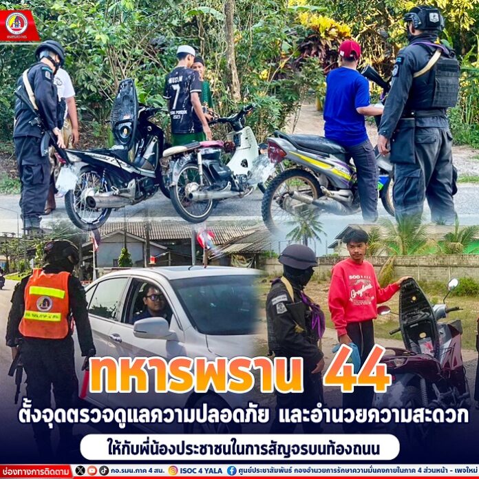 เมื่อวันที่ 21 มิถุนายน 2567 หน่วยเฉพาะกิจกรมทหารพรานที่ 44 ดำเนินการตั้งจุดตรวจ จุดสกัดในเขตพื้นที่รับผิดชอบของหน่วยทั้ง 4 อำเภอ ประกอบไปด้วย อำเภอสายบุรี, อำเภอกะพ้อ, อำเภอทุ่งยางแดง และ อำเภอไม้แก่น จังหวัดปัตตานี เพื่อปฏิบัติหน้าที่ดูแลความปลอดภัย และอำนวยความสะดวกให้กับพี่น้องประชาชน ในการสัญจรบนท้องถนน รวมไปถึงเพื่อเป็นการรักษาความปลอดภัยถนนเส้นทางสายหลักและสายรอง เพื่อควบคุมพื้นที่ ดูแลป้องกันการขนย้ายสิ่งของผิดกฎหมายต่างๆ เพื่อให้พื้นที่ปลอดเหตุ ประชาชนปลอดภัย