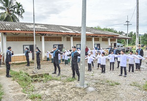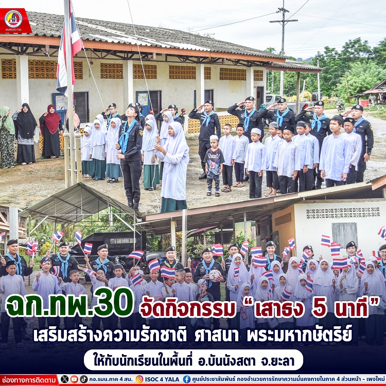 เมื่อวันที่ 22 มิถุนายน 2567 เวลา 08.00 น. หน่วยเฉพาะกิจกรมทหารพรานที่ 30 จัดกำลังพลชุดปฏิบัติการกิจการพลเรือน ร่วมกับคณะครู และนักเรียน จัดกิจกรรม “เสาธง 5 นาที” ณ โรงเรียนตาดีกามุฆซันอีบาดะห์ บ้านตะโล๊ะดือลง (ป่าหวัง) หมู่ที่ 1 ตำบลบันนังสตา อำเภอบันนังสตา จังหวัดยะลา พร้อมนำนักเรียนร้องเพลงชาติ เชิญธงชาติขึ้นสู่ยอดเสา เพื่อปลูกฝังคุณธรรม จริยธรรม สร้างสรรค์สังคมไทยปลูกจิตสำนึกให้เด็กนักเรียนเกิดความรักเทิดทูนในสถาบันชาติ ศาสนา พระมหากษัตริย์ และบรรพบุรุษที่ได้รักษาแผ่นดินไทยนี้ไว้สืบมา