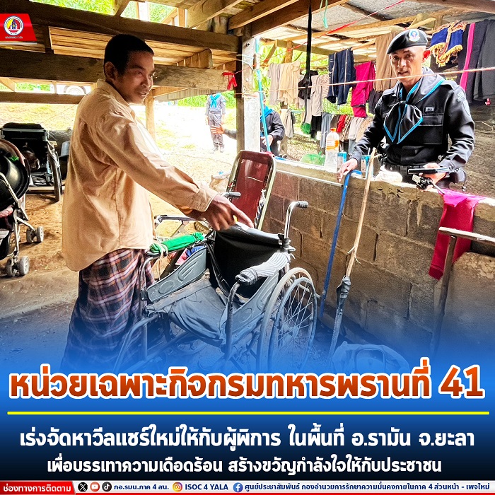 วันที่ 24 มิถุนายน 2567 หน่วยเฉพาะกิจกรมทหารพรานที่ 41 นำโดย ผู้บังคับกองร้อยทหารพรานที่ 4110 พร้อมด้วย ชุดปฏิบัติการกิจการพลเรือน กองร้อยทหารพรานที่ 4110 ลงพื้นที่ไปยังบ้านเลขที่ 320 หมู่ที่ 2 บ้านกือลอง ตำบลตลิ่งชัน อำเภอบันนังสตา จังหวัดยะลา เพื่อพบปะครอบครัวของ เด็กชายอาหะมะ อาเล็ม อายุ 13 ปี ซึ่งเป็นผู้ป่วยพิการตั้งแต่กำเนิด จึงไม่สามารถเดินได้ โดยบิดาได้ประสานขอรับสนับสนุนรถวีลแชร์ เนื่องจากคันเก่าได้ชำรุดไม่สามารถใช้งานได้ หน่วยจึงได้เร่งดำเนินการจัดหาและนำมามอบให้เพื่อบรรเทาความเดือดร้อนให้กับครอบครัวผู้พิการ เพื่อเป็นกำลังใจ และเพื่อความสะดวกในการดำเนินชีวิตประจำวัน ส่งเสริมและพัฒนาคุณภาพชีวิตผู้พิการให้ดีขึ้น