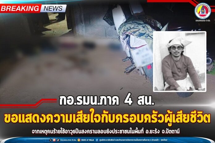 กองอำนวยการรักษาความมั่นคงภายในภาค 4 ส่วนหน้า ขอแสดงความเสียใจกับญาติและครอบครัวของผู้เสียชีวิตจากเหตุการณ์ที่เกิดขึ้น และขอความร่วมมือพี่น้องประชาชนในพื้นที่ หากผู้ใดพบเบาะแส พบวัตถุต้องสงสัย หรือบุคคลต้องสงสัยเข้ามาเคลื่อนไหวในพื้นที่ สามารถแจ้งได้ที่หมายเลขโทรศัพท์สายตรง แม่ทัพภาคที่ 4/ผู้อำนวยการรักษาความมั่นคงภายในภาค 4 โทร 061-1732999 หรือเบอร์สายด่วน กอ.รมน.ภาค 4 สน. 1341 และหน่วยเฉพาะกิจในพื้นที่ได้ตลอด 24 ชั่วโมง