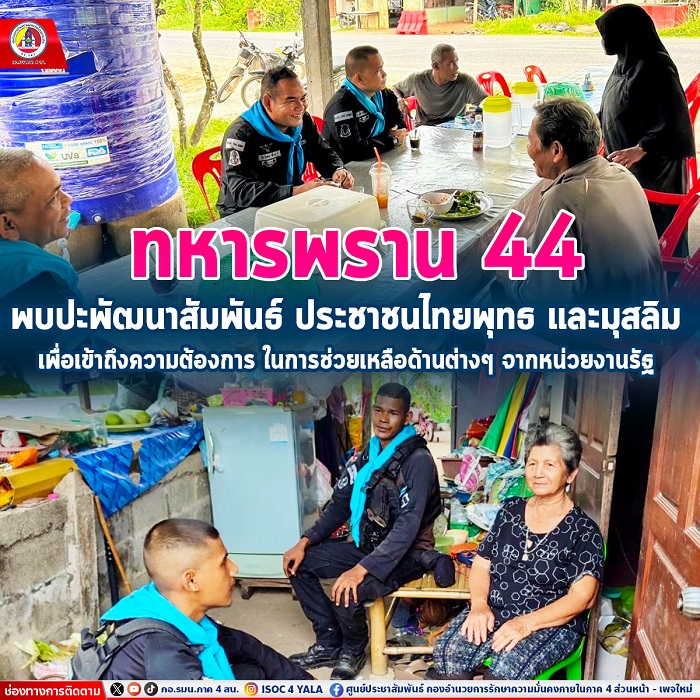 วันที่ 25 มิถุนายน 2567 หน่วยเฉพาะกิจกรมทหารพรานที่ 44 จัดกำลังพลชุดปฏิบัติการเสริมสร้างความเข้าใจ เข้าพบปะพูดคุยพัฒนาสัมพันธ์ กับพี่น้องประชาชนชาวไทยพุทธ และชาวไทยมุสลิมในพื้นที่ชุมชนต่างๆ ทั้ง 4 อำเภอ ในการควบคุมดูแลของหน่วยประกอบไปด้วย อำเภอสายบุรี, อำเภอกะพ้อ, อำเภอทุ่งยางแดง และอำเภอไม้แก่น จังหวัดปัตตานี เพื่อสอบถามความเป็นอยู่ในการดำเนินชีวิต และความต้องการในการช่วยเหลือเกี่ยวกับการพัฒนาในด้านต่างๆ จากทางภาครัฐ ตลอดจนได้แลกเปลี่ยนข้อมูลข่าวสารต่างๆ ภายในชุมชน ด้วยความห่วงใย ใส่ใจ พี่น้องประชาชนในพื้นที่ ทางหน่วยได้ลงพื้นที่ดูแลทุกข์สุขให้กับประชาชนอย่างต่อเนื่อง