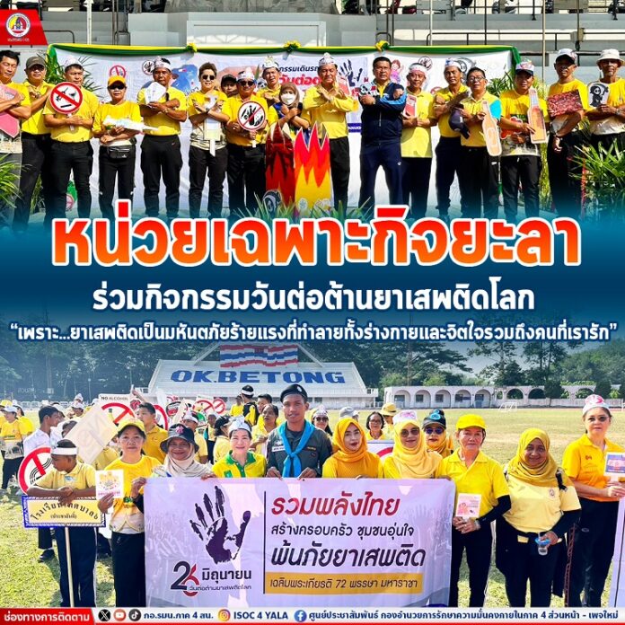เมื่อวันที่ 26 มิถุนายน 2567 เวลา 08.00 น. พลตรี นิติ ติณสูลานนท์ มอบหมายให้ ชุดปฏิบัติการกิจการพลเรือน กองร้อยหน่วยเฉพาะกิจตำรวจตระเวนชายแดนที่ 445, ชุดเสริมสร้างความเข้าใจที่ 3 หน่วยเฉพาะกิจยะลา ร่วมกับส่วนราชการในพื้นที่เข้าร่วมพิธีเปิดกิจกรรมวันต่อต้านยาเสพติดโลก พร้อมทั้งร่วมเดินรณรงค์วันต่อต้านยาเสพติดโลก เพื่อให้ประชาชนได้ตระหนักถึงพิษภัยของยาเสพติด สำหรับกิจกรรมภายในงาน ประกอบด้วย การทำลายยาเสพติด การออกกำลังกายเต้นแอโรบิคต้านภัยยาเสพติด โดยมี นายสกุล เล็งลัคน์กุล นายกเทศมนตรีเมืองเบตง เป็นประธานฯ ณ สนามกีฬาเทศบาลเมืองเบตง ตำบลเบตง อำเภอเบตง จังหวัดยะลา