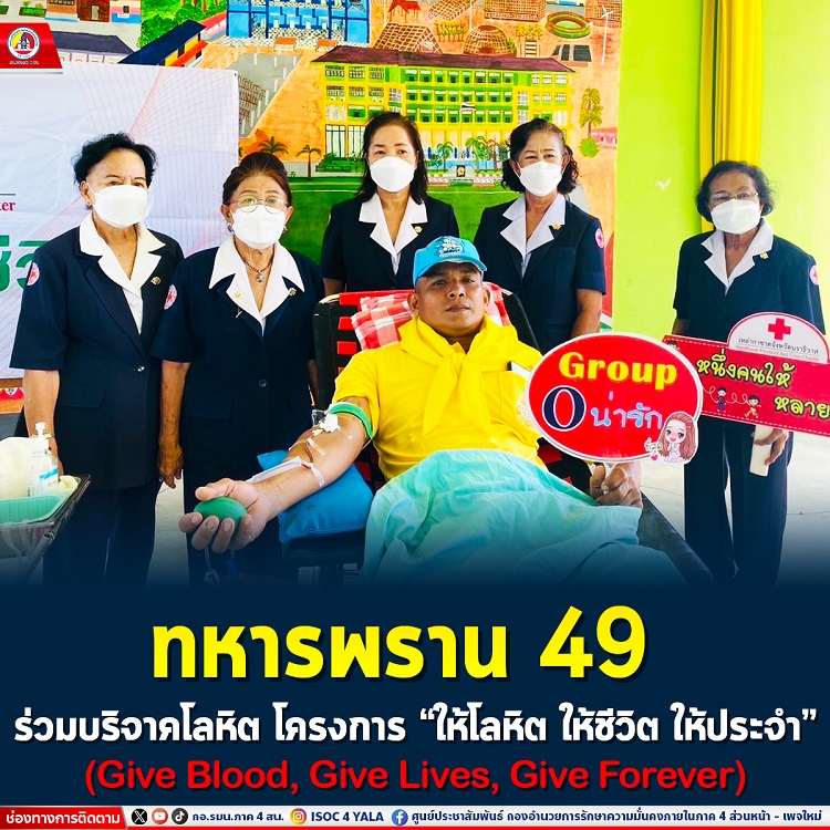 เมื่อวันที่ 26 มิถุนายน 2567 เวลา 09.00 น. หน่วยเฉพาะกิจกรมทหารพรานที่ 49 จัดกำลังพล ร่วมบริจาคโลหิตโครงการออกรับบริจาคโลหิตปี 2567 ภายใต้ชื่อโครงการ “ให้โลหิต ให้ชีวิต ให้ประจำ” (Give Blood, Give Lives, Give Forever) ณ หอประชุมโรงเรียนบ้านคอลอกาเว ตำบลศรีสาคร อำเภอศรีสาคร จังหวัดนราธิวาส โดยมอบโลหิตให้แก่โรงพยาบาลนราธิวาสราชนครินทร์ และโรงพยาบาล สุไหงโก-ลก สำหรับโลหิตที่กำลังพลบริจาคในครั้งนี้ พร้อมส่งต่อให้กับโรงพยาบาลในพื้นที่ เพื่อนำไปใช้ช่วยเหลือผู้เจ็บป่วยทั่วไป และผู้เจ็บป่วยจากสถานการณ์ความไม่สงบในพื้นที่ต่อไป
