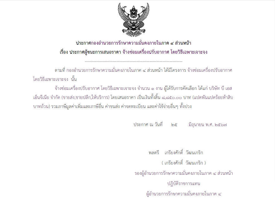 ประกาศผู้ชนะการเสนอราคา จ้างซ่อมเครื่องปรับอากาศ โดยวิธีเฉพาะเจาะจง