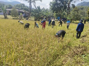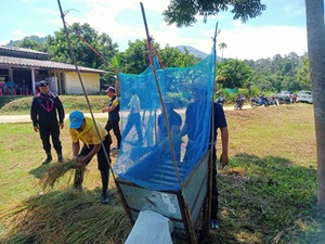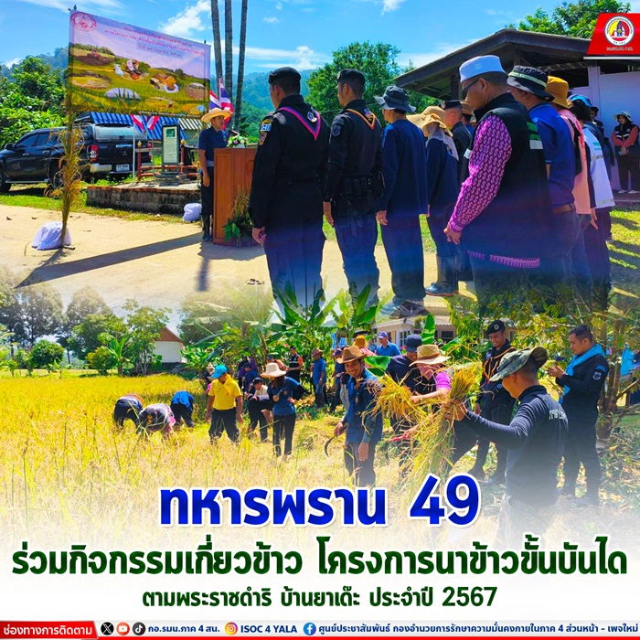 เมื่อวันที่ 27 มิถุนายน 2567 เวลา 10.00 น. หน่วยเฉพาะกิจกรมทหารพรานที่ 49 นำโดย ร้อยโท อัครายุทธ สีดาโคตร ผู้บังคับกองร้อยทหารพรานที่ 4908 พร้อมด้วย กำลังพลชุดปฏิบัติการกิจการพลเรือน ร่วมกับ หัวหน้าส่วนราชการ และประชาชนในพื้นที่ตำบลมาโมง เข้าร่วมกิจกรรมเก็บเกี่ยวข้าว ตามโครงการนาข้าวขั้นบันได ตามพระราชดำริ บ้านยาเด๊ะ ประจำปี 2567 ณ แปลงนาโครงการฯ บ้านยาเด๊ะ หมู่ที่ 2 ตำบลมาโมง อำเภอสุคิริน จังหวัดนราธิวาส เพื่ออนุรักษ์วัฒนธรรมประเพณี ภูมิปัญญาท้องถิ่น วิถีชีวิตพื้นบ้านอันดีงาม ซดำรงไว้ซึ่งกิจกรรมลงแขกเกี่ยวข้าว สร้างขวัญกำลังใจให้แก่สมาชิกนาข้าวขั้นบันได และแสดงออกถึงความพร้อมเพรียงในการส่งเสริมสนับสนุนโครงการพระราชดำริ พร้อมอำนวยความสะดวกแก่ประชาชน และเสริมสร้างความสัมพันธ์อันดีต่อกันระหว่างเจ้าหน้าที่รัฐกับประชาชนในพื้นที่ โดยมี นายธีรศักดิ์ สังขโชติ นายอำเภอสุคิริน เป็นประธานในพิธี