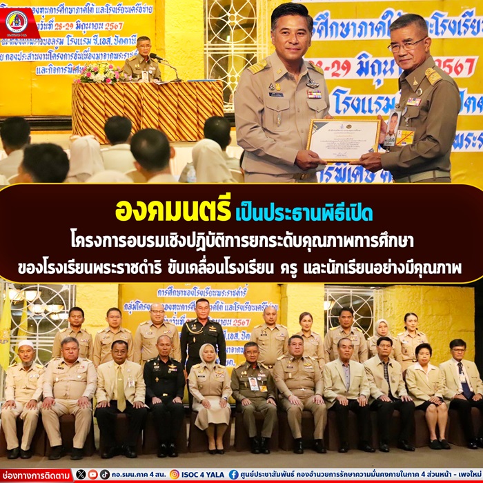 วันนี้ 28 มิถุนายน 2567 เวลา 09.00 น. ที่ห้องน้ำพราว โรงแรมซี.เอส.ปัตตานี อำเภอเมือง จังหวัดปัตตานี พลเอกเฉลิมชัย สิทธิสาท องคมนตรี เป็นประธานพิธีเปิดและเข้าร่วมสังเกตการณ์โครงการอบรมเชิงปฏิบัติการยกระดับคุณภาพการศึกษาของโรงเรียนพระราชดำริ กลุ่มโรงเรียนโครงการกองทุนการศึกษาพื้นที่ภาคใต้ โดยมี พลตำรวจโท วรรณพงษ์ คชรักษ์ เลขาธิการศูนย์อำนวยการบริหารจังหวัดชายแดนภาคใต้ , พลตรี กรกฎ ภู่โชติ รองผู้อำนวยการรักษาความมั่นคงภายในภาค 4 ส่วนหน้า , นางพาตีเมาะ สะดียามู ผู้ว่าราชการจังหวัดปัตตานี ให้การต้อนรับ พร้อมด้วย คณะผู้บริหาร คณะครูและบุคลากรโรงเรียนพระราชดำริ กลุ่มโครงการกองทุนการศึกษาภาคใต้ ตลอดจนโรงเรียนเครือข่าย อาสาสมัครส่วนกลาง อาสาสมัครประจำจังหวัด เข้าร่วมประชุม