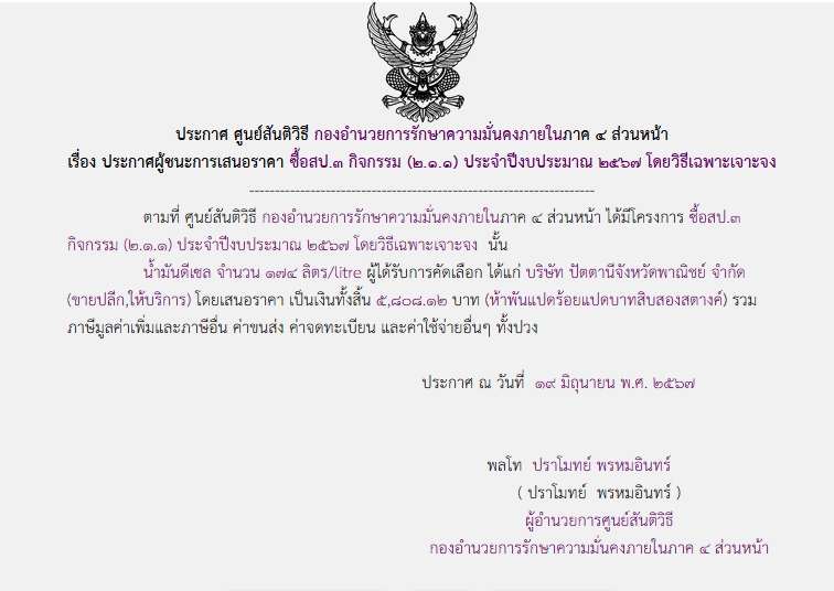 ประกาศผู้ชนะการเสนอราคา ซื้อสป.๓ กิจกรรมที่ (๒.๑.๑)ประจำปีงบประมาณ ๒๕๖๗ โดยวิธีเฉพาะเจาะจง