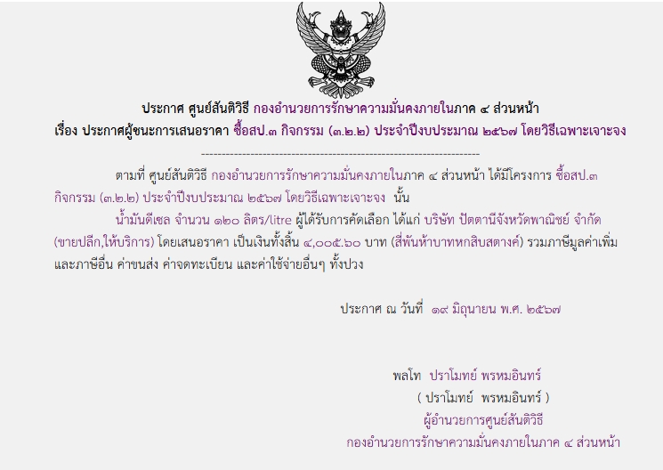 ประกาศผู้ชนะการเสนอราคา ซื้อสป.๓ กิจกรรมที่ (๓.๒.๒)ประจำปีงบประมาณ ๒๕๖๗ โดยวิธีเฉพาะเจาะจง