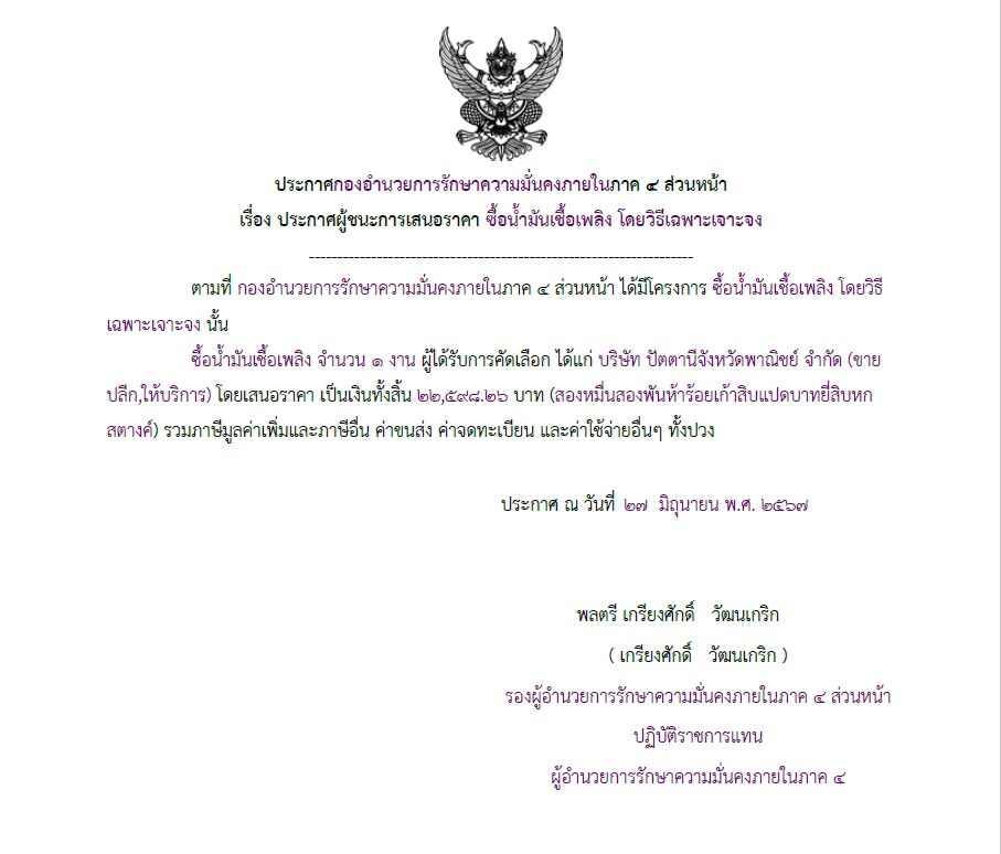 ประกาศผู้ชนะการเสนอราคา ซื้อน้ำมันเชื้อเพลิง โดยวิธีเฉพาะเจาะจง