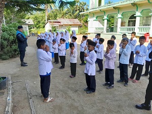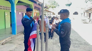 เมื่อวันที่ 29 มิถุนายน 2567 พันเอก สิทธิชัย บำรุงเขต ผู้บังคับหน่วยเฉพาะกิจกรมทหารพรานที่ 46 มอบหมายให้ ชุดปฏิบัติการกิจการพลเรือนของหน่วย ร่วมกับคณะครู และนักเรียน จัดกิจกรรมเคารพธงชาติหน้าเสาธง 5 นาที นำนักเรียนร้องเพลงชาติ เชิญธงชาติขึ้นสู่ยอดเสา เพื่อปลุกจิตสำนึกให้เด็ก เยาวชน มีความรักชาติ ศาสนา และสถาบันพระมหากษัตริย์ พร้อมทั้งเปลี่ยนธงชาติผืนใหม่ให้กับสถานศึกษา รวมถึงให้ความรู้เกี่ยวกับประวัติศาสตร์ความเป็นมาของ “ธงไตรรงค์ ธงชาติไทย” เพื่อให้นักเรียนได้รู้ถึงความหมายและความสำคัญของธงชาติไทย ณ ศูนย์การศึกษาอิสลามประจำมัสยิด (ตาดีกา) ดารุสซาลัม ตำบลเรียง อำเภอรือเสาะ จังหวัดนราธิวาส