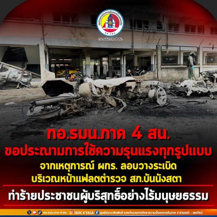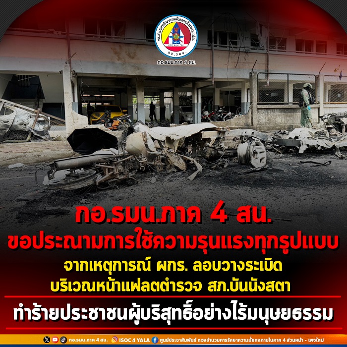 กองอำนวยการรักษาความมั่นคงภายในภาค 4 ส่วนหน้า ขอแสดงความเสียใจต่อครอบครัวผู้เสียชีวิตและผู้บาดเจ็บจากเหตุการณ์ความรุนแรงที่เกิดขึ้น อีกทั้งจะเร่งรีบดำเนินการตามกระบวนการยุติธรรม เพื่อนำตัวผู้กระทำผิดมาลงโทษตามกฎหมายโดยเร็วที่สุด เพื่อลดความเคลือบแคลงสงสัยและสร้างความเชื่อมั่นให้พี่น้องประชาชนในพื้นที่จังหวัดชายแดนภาคใต้ให้ดำเนินชิวิตได้อย่างปกติสุข รวมทั้งขอความร่วมมือพี่น้องประชาชนในพื้นที่ หากผู้ใดพบเบาะแส หรือพบวัตถุต้องสงสัย รวมถึงบุคคลต้องสงสัยเข้ามาเคลื่อนไหวในพื้นที่ สามารถแจ้งได้ที่หมายเลขโทรศัพท์สายตรง แม่ทัพภาคที่ 4 / ผู้อำนวยการรักษาความมั่นคงภายในภาค 4 โทร 061-1732999 หรือเบอร์สายด่วน กอ.รมน.ภาค 4 สน. 1341 และหน่วยเฉพาะกิจในพื้นที่ได้ตลอด 24 ชั่วโมง