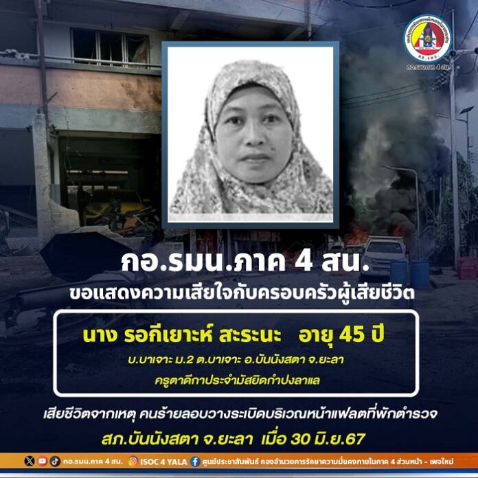 นับว่าเป็นการสูญเสียบุคลากรที่มีความสำคัญคนหนึ่งในพื้นที่ เนื่องจากผู้เสียชีวิตเป็นครูตาดีกาประจำมัสยิดกำปงลาแล ซึ่งที่ผ่านมาคอยทำหน้าที่อบรมสั่งสอน เด็ก ๆ ตาดีกา ให้เรียนรู้ภาษาและวัฒนธรรมของชาวมลายู ปลูกฝังหลักคำสอนของศาสนาให้เด็กมีจริยธรรม เป็นคนดีของสังคม ร่วมกันพัฒนาการศึกษาและสังคมในพื้นที่จังหวัดชายแดนภาคใต้ให้เกิดสันติสุขอย่างยั่งยืนตลอดไป