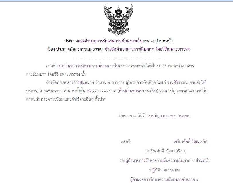 ประกาศผู้ชนะการเสนอราคา จ้างจัดทำเอกสารการสัมมนาฯ โดยวิธีเฉพาะเจาะจง