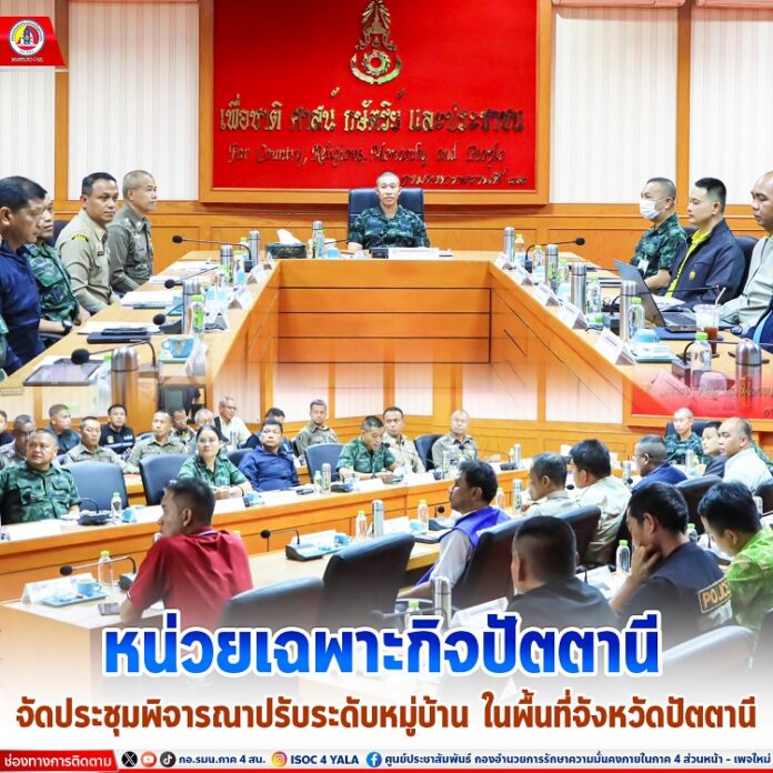 เมื่อวันที่ 3 กรกฎาคม 2567 เวลา 13.30 น. ที่ห้องประชุมพรานไพร หน่วยเฉพาะกิจกรมทหารพรานที่ 43 อำเภอหนองจิก จังหวัดปัตตานี พันเอก ยุทธนา สายประเสริฐ รองผู้อำนวยการสำนักนโยบายและแผน กองอำนวยการรักษาความั่นคงภายในภาค 4 ส่วนหน้า พร้อมด้วย พันเอก พรชัย นิ่มทัศนศิริ หัวหน้าคณะทำงาน / เสนาธิการหน่วยเฉพาะกิจปัตตานี ร่วมเป็นประธานการประชุมพิจารณาปรับระดับหมู่บ้าน ในพื้นที่จังหวัดปัตตานี โดยมีผู้แทนสำนักอำนวยการข่าวกรอง กองอำนวยการรักษาความั่นคงภายในภาค 4 ส่วนหน้า, ผู้แทนศูนย์สันติวิธี กองอำนวยการรักษาความมั่นคงภายในภาค 4 ส่วนหน้า, รองผู้บังคับการภูธรจังหวัดปัตตานี และตัวแทนศูนย์ปฏิบัติการอำเภอ เข้าร่วมประชุมฯ โดยพร้อมเพรียง