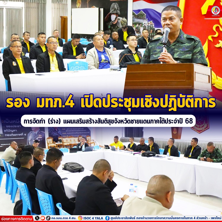 โอกาสนี้ รองแม่ทัพภาคที่ 4 / รองผู้อำนวยการรักษาความมันคงภายในภาค 4 ส่วนหน้า ระบุว่าการประชุมเชิงปฏิบัติการในวันนี้ถือเป็นขั้นที่ 3 ในการจัดทำ (ร่าง) แผนเสริมสร้างสันติสุขจังหวัดชายแดนภาคใต้ ประจำปี พุทธศักราช 2568 ตามที่ผู้แทนหน่วยร่วมกันออกแบบการยุทธ์ (ADM) และแสวงข้อตกลงใจทางทหาร (MDMP) ได้แผนยุทธการหลักแล้วในขั้นที่ 1 และ ขั้นที่ 2 เพื่อให้แผนเสริมสร้างสันติสุขจังหวัดชายแดนภาคใต้ ประจำปี 2568 มีความสมบูรณ์ สามารถนำไปสู่การปฏิบัติในการแก้ไขปัญหาความไม่สงบในพื้นที่จังหวัดชายแดนภาคใต้ ได้อย่างมีประสิทธิภาพและเป็นรูปธรรม พร้อมย้ำว่า ให้นำมาซึ่งแผนยุทธการหลักในการรับมือกับสถานการณ์ได้ทันท่วงที กำชับให้ผู้เข้าร่วมประชุมเชิงปฏิบัติการ ใช้ความรู้และประสบการณ์ร่วมกันทบทวนการปฏิบัติงานให้ครอบคลุมทุกมิติ ตามแนวทางการแก้ไขปัญหาความไม่สงบในพื้นที่จังหวัดชายแดนภาคใต้ เพื่อนำพาความสงบนำสันติสุขสู่พี่น้องประชาชนในพื้นที่อย่างยั่งยืน