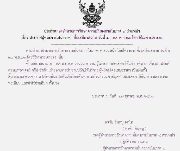 ประกาศผู้ชนะการเสนอราคา ซื้อเสบียงสนาม วันที่ 1-30 พ.ย.63 โดยวิธีเฉพาะเจาะจง ( 78,750.00 บาท )