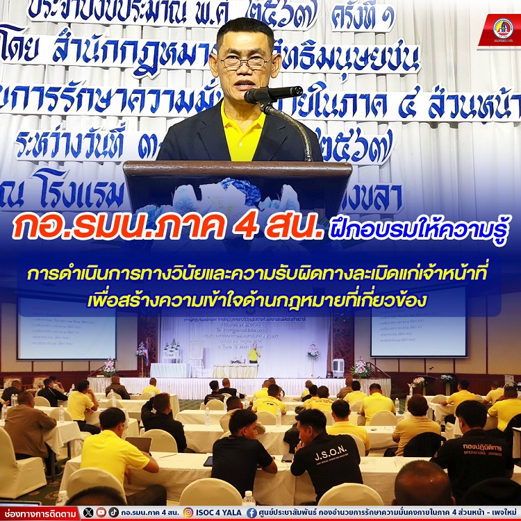 เมื่อวันที่ 3 กรกฎาคม 2567 เวลา 09.00 น. พันเอก อัทฒเศรษฐ์ เต็มมีศรี รองเลขาธิการกองอำนวยการรักษาความมั่นคงภายในภาค 4 ส่วนหน้า เป็นประธานพิธีเปิดการฝึกอบรมหลักสูตรการดำเนินการทางวินัยและความรับผิดทางละเมิดของเจ้าหน้าที่ ครั้งที่ 1 ณ ห้องสมิหลา 1 โรงแรมบีพี่ สมิหลา บีช รีสอร์ท อำเภอเมืองจังหวัดสงขลา เพื่อเพิ่มความรู้การดำเนินการทางวินัยและความรับผิดทางละเมิดของเจ้าหน้าที่ สร้างความเข้าใจด้านกฎหมายที่เกี่ยวข้อง พร้อมแนวทางการสอบข้อเท็จจริงการรับผิดทางละเมิดของเจ้าหน้าที่ โดยมี พันเอก มานะ ปริญญาศิริ รองผู้อำนวยการสำนักกฎหมายและสิทธิมนุษยชน กองการรักษาความมั่นคงภายในภาค 4 ส่วนหน้า เจ้าหน้าที่ทหาร ตำรวจที่ปฏิบัติงานในพื้นที่จังหวัดชายแดนภาคใต้ ร่วมให้การต้อนรับ