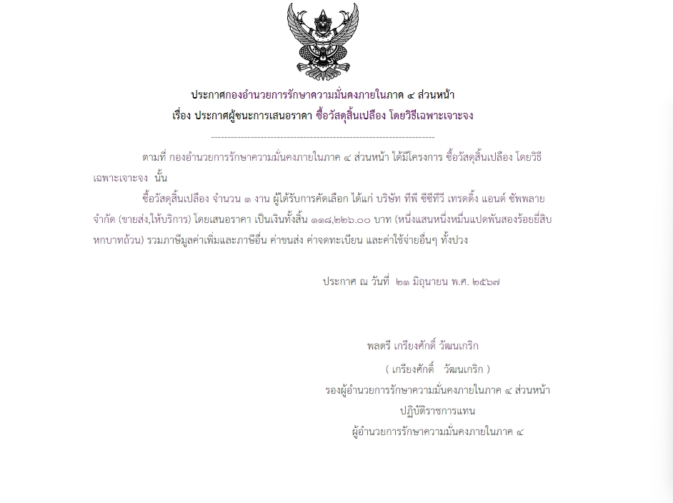 ประกาศผู้ชนะการเสนอราคา ซื้อวัสดุสิ้นเปลือง โดยวิธีเฉพาะเจาะจง