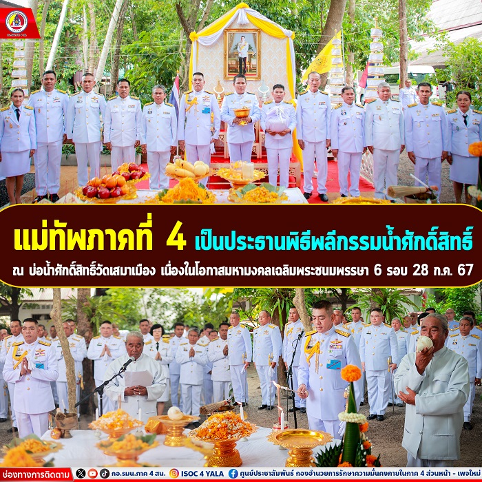 วันที่ 4 กรกฎาคม 2567 เวลา 14.49 น. พลโท ศานติ ศกุนตนาค แม่ทัพภาคที่ 4 เป็นประธานในพิธีพลีกรรมน้ำศักดิ์สิทธิ์ ณ บ่อน้ำศักดิ์สิทธิ์วัดเสมาเมือง เนื่องในโอกาสมหามงคลเฉลิมพระชนมพรรษา 6 รอบ 28 ก.ค. 67 โดยมีข้าราชการจากกองทัพภาคที่ 4 ส่วนราชการต่าง ๆ ทั้งภาครัฐ ภาคเอกชน เข้าร่วมพิธีโดยพร้อมเพรียงกัน