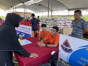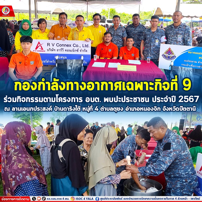 กองกำลังทางอากาศเฉพาะกิจที่ 9 นำโดย นาวาอากาศเอก จุมพล กลิ่นผา ผู้บังคับการกองกำลังทางอากาศเฉพาะกิจที่ 9 มอบหมายให้ เรืออากาศเอก ศราวุธ ศรีอ่อนทอง หัวหน้าฝ่ายกิจการพลเรือน ร่วมพิธีเปิด และสนับสนุนการออกหน่วยบริการประชาชน จัดเลี้ยงไอศครีมให้กับประชาชนภายในงาน และดำเนินการสำรวจข้อมูลคนพิการและผู้ป่วยผู้สูงอายุ ที่มีความต้องการรถเข็นวีลแชร์ ซึ่งเป็นรถเข็นที่ได้รับการสนับสนุนบริจาคภายใต้โครงการแม่บ้านทัพฟ้าพัฒนาศักยภาพคนพิการจังหวัดชายแดนภาคใต้ โดยศูนย์เรียนรู้ร่วมเพื่อการพัฒนาศักยภาพคนพิการจังหวัดชายแดนภาคใต้ จะดำเนินการลงพื้นที่เยี่ยมบ้านและบริการส่งมอบรถเข็นวีลแชร์ให้ผู้ที่ลงทะเบียนไว้ภายในงานอีกครั้ง ตามแนวทางการดำเนินงานเพื่อสร้างเครือข่ายคนพิการที่เข้มแข็ง และร่วมสร้างใต้สันติสุข อย่างยั่งยืน