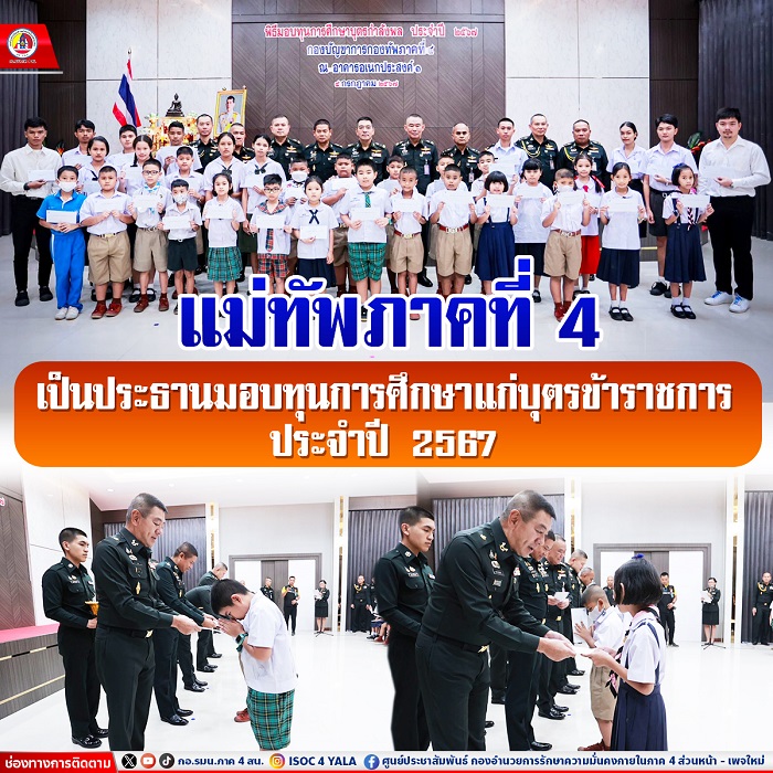 วันที่ 4 กรกฎาคม 2567 เวลา 0930 ที่อาคารอเนกประสงค์ 1 กองบัญชาการกองทัพภาคที่ 4 ค่ายวชิราวุธ อ.เมือง จ.นครศรีธรรมราช พลโท ศานติ ศกุนตนาค แม่ทัพภาคที่ 4 เป็นประธานมอบทุนการศึกษาให้แก่บุตรข้าราชการ โดยมีวัตถุประสงค์ที่จะส่งเสริมการศึกษาให้แก่บุตรที่มีผลการเรียนดีมีความประพฤติเรียบร้อย ขยันหมั่นเพียร ตั้งใจในการศึกษาเล่าเรียน โดยมีผู้อำนวยการกองฝ่ายเสนาธิการกองทัพภาคที่ 4, พ่อแม่ผู้ปกครอง และบุตรของกำลังพลที่รับทุนการศึกษาเข้าร่วมพิธีโดยพร้อมเพรียงกัน