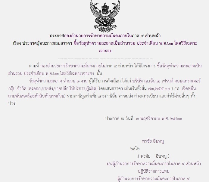 ประกาศผู้ชนะการเสนอราคา ซื้อวัสดุทำความสะอาดส่วนรวม ประจำเดือน พ.ย.63 โดยวิธีเฉพาะเจาะจง ( 73,255.00 บาท )