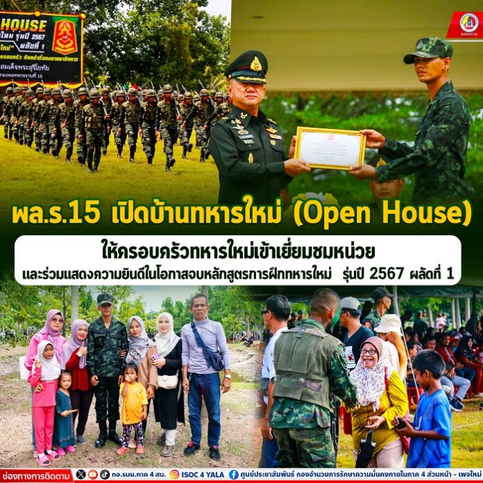วันที่ 5 กรกฎาคม 2567 ณ ค่ายสมเด็จพระสุริโยทัย กองพลทหารราบที่ 15 อำเภอหนองจิก จังหวัดปัตตานี พันเอก ณรงค์ ตันติสิทธิพร รองผู้บัญชาการกองพลทหารราบที่ 15 เป็นประธานเปิดกิจกรรม Open house ของหน่วยฝึกทหารใหม่ รุ่นปี 2567 ผลัดที่ 1 ในพื้นที่จังหวัดปัตตานี โดยกองพลทหารราบที่ 15 จัดขึ้นเพื่อเปิดโอกาสให้ครอบครัวทหารใหม่ได้เข้าเยี่ยมชมหน่วยทหาร สร้างสายใยอันดีระหว่างหน่วยกับทหารใหม่ พร้อมรับชมการแสดงจากทหารใหม่ และร่วมแสดงความยินดีกับทหารใหม่ที่ได้รับใบประกาศนีบัตรการทดสอบร่างกาย และการยิงปืนด้วยกระสุนจริงดีเยี่ยม โดยมี คณะผู้บังคับบัญชาจากหน่วยขึ้นตรงกองพลทหารราบที่ 15 , ทหารใหม่จากหน่วยฝึกทหารใหม่ หน่วยขึ้นตรงกองพลทหารราบที่ 15 ในพื้นที่จังหวัดปัตตานี จำนวน 4 หน่วยฝึก ประกอบด้วย หน่วยฝึกทหารใหม่กองพันทหารราบที่ 1 , หน่วยฝึกทหารใหม่กองพันทหารราบที่ 2 , หน่วยฝึกทหารใหม่กองพันทหารราบที่ 3 กรมทหารราบที่ 153 และหน่วยฝึกทหารใหม่ กองพันทหารช่างที่ 15 กองพลทหารราบที่ 15 ตลอดจนครอบครัวทหารใหม่ร่วมกิจกรรม และร่วมชมการแสดงจากการฝึกของทหารใหม่ในครั้งนี้