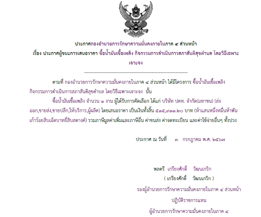ประกาศผู้ชนะการเสนอราคา ซื้อน้ำมันเชื้อเพลิง โดยวิธีเฉพาะเจาะจง