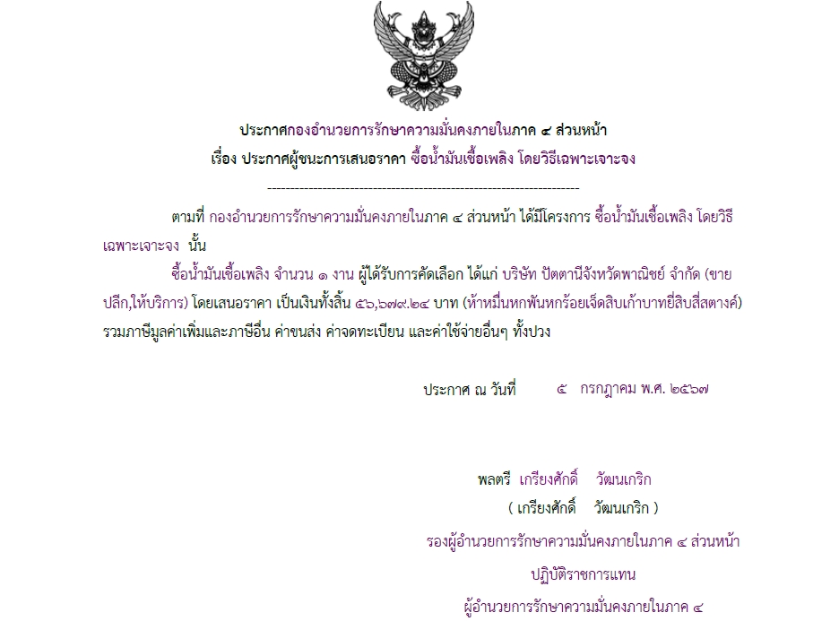 ประกาศผู้ชนะการเสนอราคา ซื้อน้ำมันเชื้อเพลิง โดยวิธีเฉพาะเจาะจง
