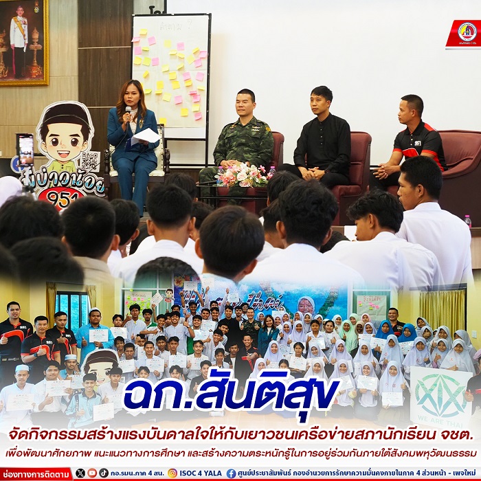 เมื่อวันที่ 5 กรกฎาคม 2567 หน่วยเฉพาะกิจสันติสุข โดย ชุดควบคุมที่ ๙๕๑ ร่วมกับ พันเอกนายแพทย์ภาคย์ โลหารชุน แพทย์ใหญ่หน่วยบัญชาการสงครามพิเศษ จัดกิจกรรมสร้างแรงบันดาลใจให้กับเยาวชนเครือข่ายสภานักเรียนจังหวัดชายแดนภาคใต้ จำนวน 60 คน ภายใต้โครงการ “ว่าไงวัยรุ่น เรื่องวุ่นๆ ของวัยรุ่น จชต.” เรื่องกินยังต้องคิด เรื่องชีวิตไม่คิดได้ไง มาเข้าใจตัวตน ค้นหาความฝัน สร้าง Motivation แบบวัยรุ่น โดยมีกิจกรรม Work shop พัฒนาศักยภาพ เพื่อแนะแนวการศึกษา โรงเรียนเตรียมทหาร โรงเรียนนายสิบทหารบก นายสิบตำรวจ ช่างฝีมือทหาร สถาบันปัญญาภิวัฒน์ และวิทยาลัยพยาบาลทหารบก พร้อมทั้งสอดแทรกการตระหนักรู้สถานการณ์ สร้างการรับรู้ข้อมูลที่ถูกต้อง และการอยู่ร่วมกันในสังคมพหุวัฒนธรรม โดยมี อาจารย์วาริน นาราวิทย์ และ พันเอกนายแพทย์ภาคย์ โลหารชุน ร่วมเป็นวิทยากร ณ อาคารเรียน ๑๐๐ ปี มอาหดิลอูลูม โรงเรียนเตรียมศึกษาวิทยา อำเภอเมือง จังหวัดปัตตานี