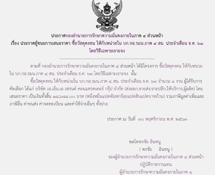 ประกาศผู้ชนะการเสนอราคา ซื้อวัสดุคงทน ให้กับหน่วยใน บก.กอ.รมน.ภาค 4 สน. ประจำเดือน ธ.ค.63 โดยวิธีเฉพาะเจาะจง ( 18,688.00 บาท )