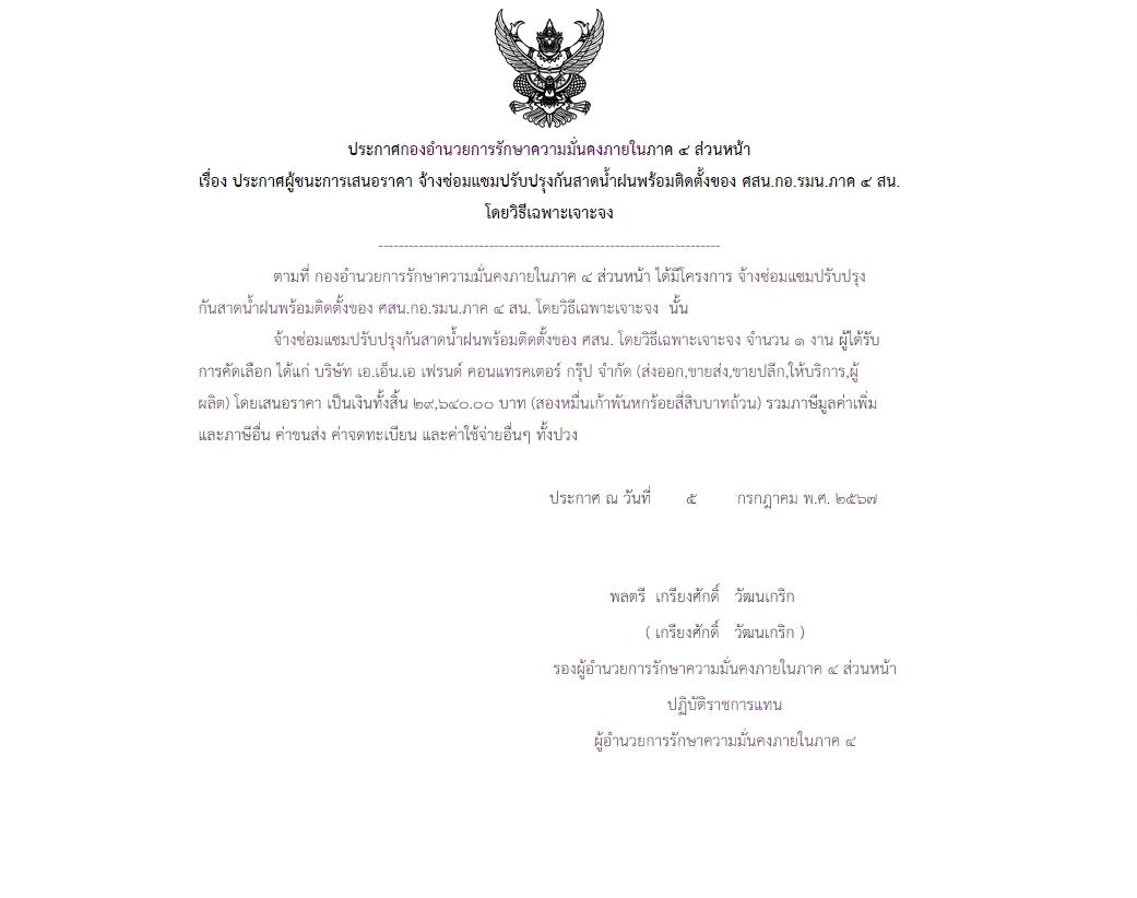 จัดซื้อ จัดจ้างประกาศผู้ชนะการเสนอราคา ประกาศผู้ชนะการเสนอราคา จ้างซ่อมแซมปรับปรุงกันสาดน้ำฝนพร้อมคิดตั้งของ ศสน..อ.รมน..ภาค ๔ สน. โดยวิธีเฉพาะเจาะจง July 9, 2024 365 Share Facebook Twitter Google+ Telegram LINE