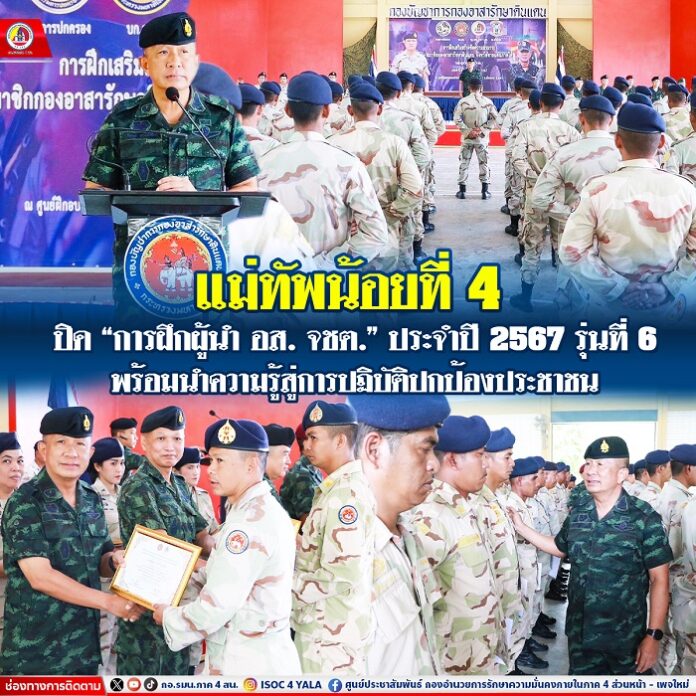 วันนี้ 9 กรกฎาคม 2567 เวลา 10.00 น. ณ กองบังคับการควบคุมกองอาสารักษาดินแดนจังหวัดชายแดนภาคใต้ ศูนย์ฝึกอบรมกองกำลังประจำถิ่นท่าสาป อำเภอเมืองยะลา จังหวัดยะลา พลโท ปราโมทย์ พรหมอินทร์ แม่ทัพน้อยที่ 4/ รองผู้อำนวยการรักษาความมั่นคงภายในภาค 4 ส่วนหน้า เป็นประธานปิดการฝึกเสริมสร้างขีดความสามารถสมาชิกกองอาสารักษาดินแดนจังหวัดชายแดนภาคใต้ (หลักสูตรผู้นำ อส.จชต.) ประจำปี 2567 รุ่นที่ 6 ได้มอบประกาศนียบัตรให้ผู้ที่มีผลการฝึกดีเด่นประจำรุ่น และมอบประกาศนียบัตรให้ผู้เข้ารับการฝึกทั้งหมด โดยมีผู้บังคับบัญชา ผู้บังคับการควบคุมกองอาสารักษาดินแดนจังหวัดชายแดนภาคใต้, หัวหน้าชุดคุ้มครองตำบล และผู้เข้ารับการฝึกฯ เข้าร่วมในพิธี