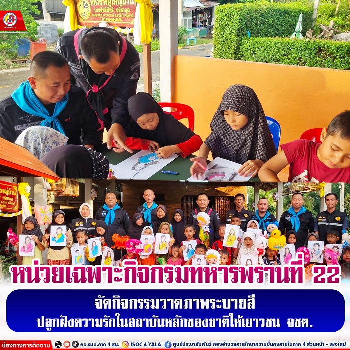 เมื่อวันที่ 9 กรกฎาคม 2567 หน่วยเฉพาะกิจกรมทหารพรานที่ 22 จัดกำลังพลชุดปฏิบัติการกิจการพลเรือน เข้าพบปะพัฒนาสัมพันธ์กับเด็กและเยาวชนในพื้นที่ ตำบลเมาะมาวี อำเภอยะรัง จังหวัดปัตตานี พร้อมร่วมจัดกิจกรรมวาดภาพระบายสี เนื่องในโอกาสวันคล้ายวันประสูติ สมเด็จพระเจ้าน้องนางเธอ เจ้าฟ้าจุฬาภรณวลัยลักษณ์ อัครราชกุมารี กรมพระศรีสวางควัฒน วรขัตติยราชนารี เพื่อแสดงความรักสถาบันพระมหากษัตริย์ เเละช่วยส่งเสริมจินตนาการรวมถึงการแสดงออกอย่างสร้างสรรค์ของเด็ก ๆ ในพื้นที่ ณ ที่ทำการผู้ใหญ่บ้าน หมู่ที่ 1 บ้านต้นไพ ตำบลเมาะมาวี อำเภอยะรัง จังหวัดปัตตานี