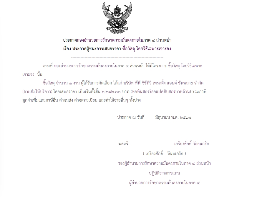 ประกาศผู้ชนะการเสนอราคา ซื้อวัสดุ โดยวิธีเฉพาะเจาะจง