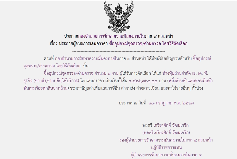 ประกาศผู้ชนะการเสนอราคา ซื้ออุปกรณ์จุดตรวจ/ด่นตรวจ โดยวิธีคัดเลือก