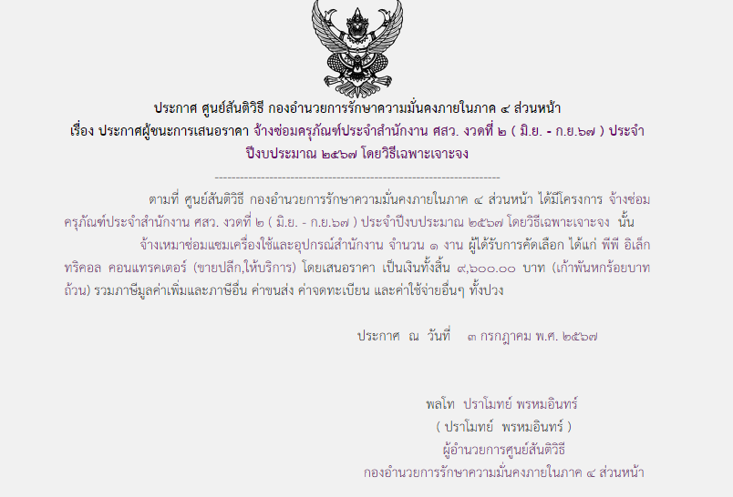 จัดซื้อ จัดจ้างประกาศผู้ชนะการเสนอราคา ประกาศผู้ชนะการเสนอราคา จ้างซ่อมครุภัณฑ์ประจำสำนักงาน ศสว. งวดที่ ๒ ( มิ.ย. -ก.ย.๖๗) ประจำ ปีงบประมาณ ๒๕๖๗ โดยวิธีเฉพาะเจาะจง July 12, 2024 302 Share Facebook Twitter Google+ Telegram LINE
