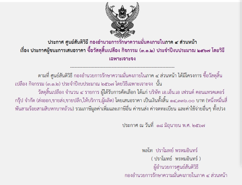 จัดซื้อ จัดจ้างประกาศผู้ชนะการเสนอราคา ประกาศผู้ชนะการเสนอราคา ซื้อวัสดุสิ้นเปลือง กิจกรรม (๓.๑.๒) ประจำปีงบประมาณ ๒๕๖๗ โดยวิธี เฉพาะเจาะจง July 12, 2024 303 Share Facebook Twitter Google+ Telegram LINE