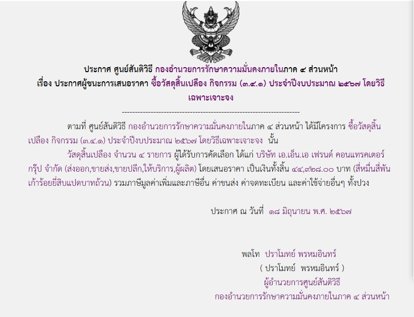 ประกาศผู้ชนะการเสนอราคา ซื้อวัสดุสิ้นเปลือง กิจกรรม (๓.๔.๑) ประจำปีงบประมาณ ๒๕๖๗ โดยวิธี เฉพาะเจาะจง