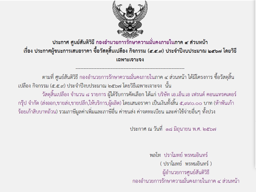ประกาศผู้ชนะการเสนอราคา ซื้อวัสดุสิ้นเปลือง กิจกรรม (๕.๕.๙) ประจำปีงบประมาณ ๒๕๖๗ โดยวิธี เฉพาะเจาะจง